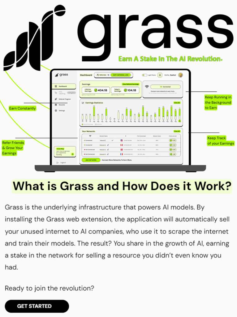 Grass.io is an innovative decentralized platform that utilizes unused internet bandwidth to scrape public web data for AI training purposes. Developed by Wynd Network, Grass aims to create a decentralized oracle for AI by transforming public web data into structured datasets. Here’s a detailed look at how Grass.io works, its recent funding success, and the earning potential for users.
